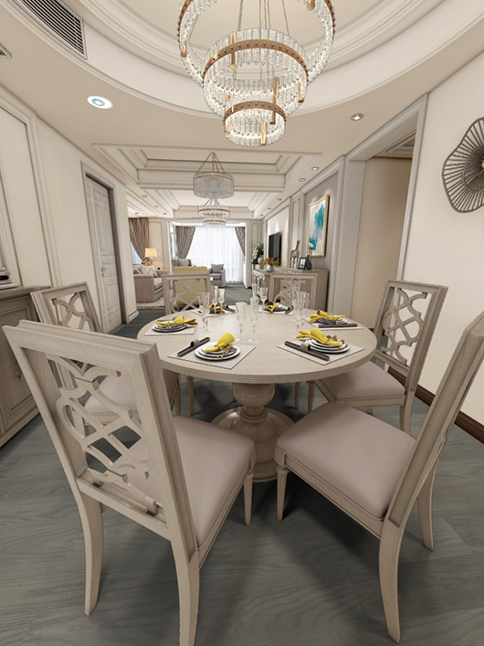 木质餐桌椅温润而自然,配以简单而精致的餐具与摆件,迎面扑来的是居家的生活气息。在木地板或透亮清灰,或清新雅丽的气质衬托之下,整个空间显得温暖而美好。