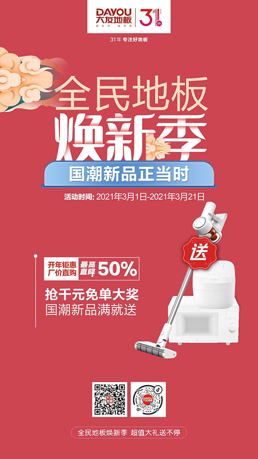 又到了一年一度的3.15国际消费者权益日,为了满足春日装修季的需求,为了让更多的消费者选购到安全、健康的地板,大友地板特推出“全民焕新季”活动,正在火热进行中!