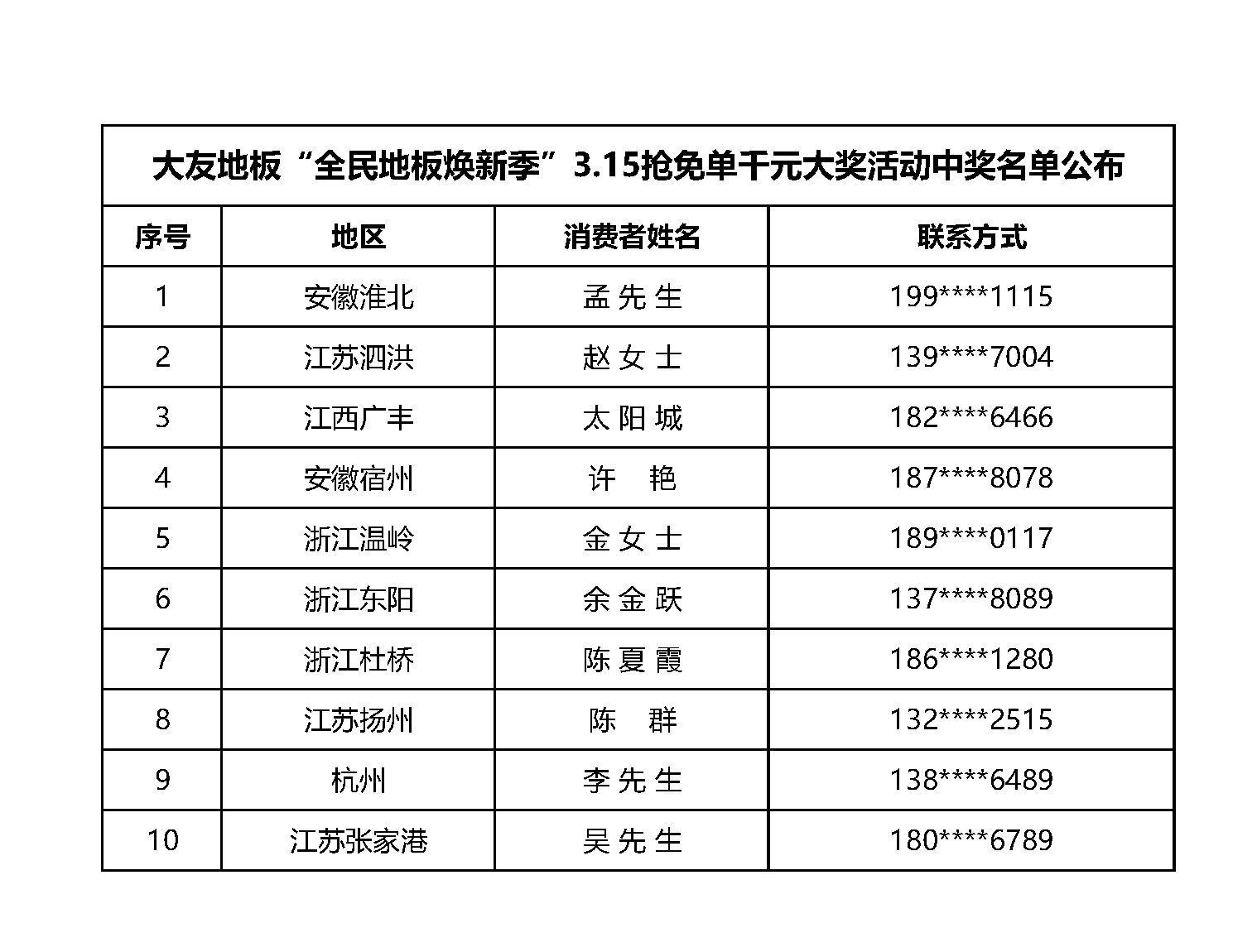 大友地板“全民地板焕新季” 3.15抢免单千元大奖抽奖活动,通过大友地板官方抖音平台的直播,在所有消费者的见证下,抽取了本次活动的获奖名单。本次抽奖真实、有效,特在此公布,具体名单如下表。